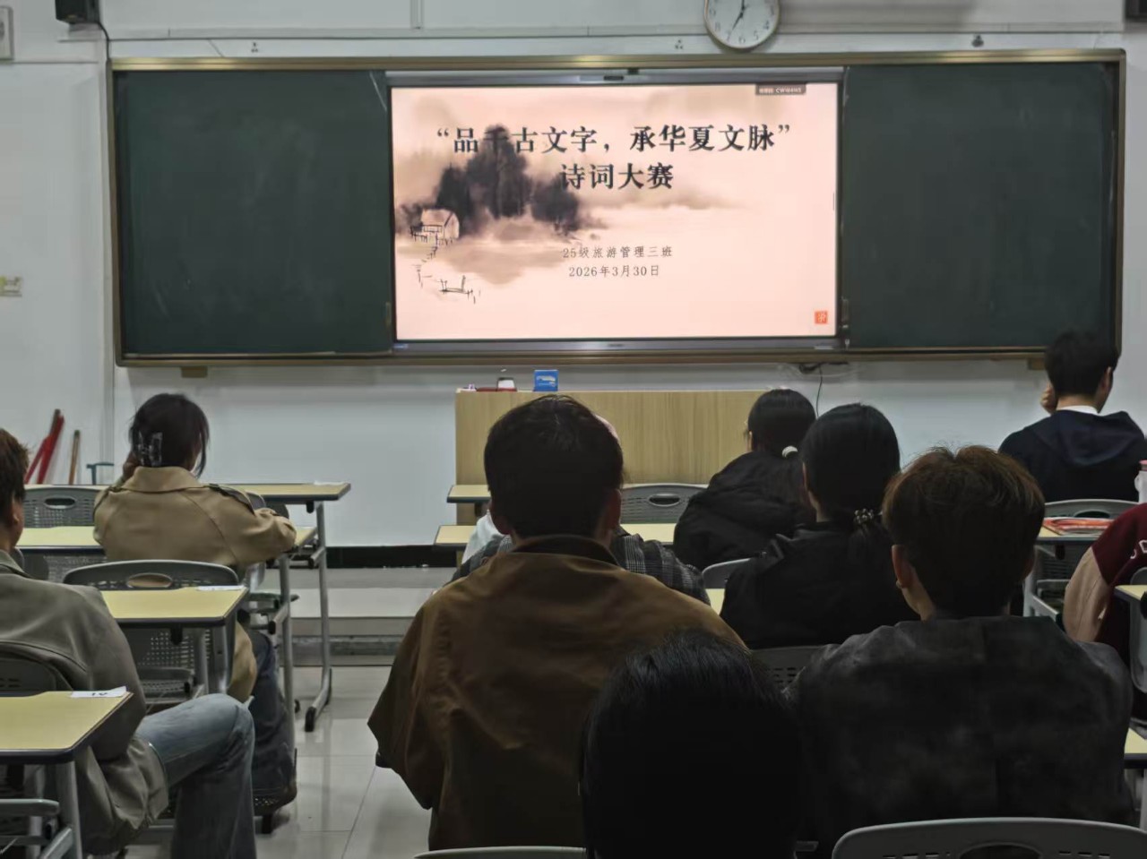 2026年3月30日,人文社会科学系2025级旅游管理3班举办“品千古文字,承华夏文脉”主题诗词比赛,全班同学齐聚一堂,共赏诗词之美,传承中华文脉。